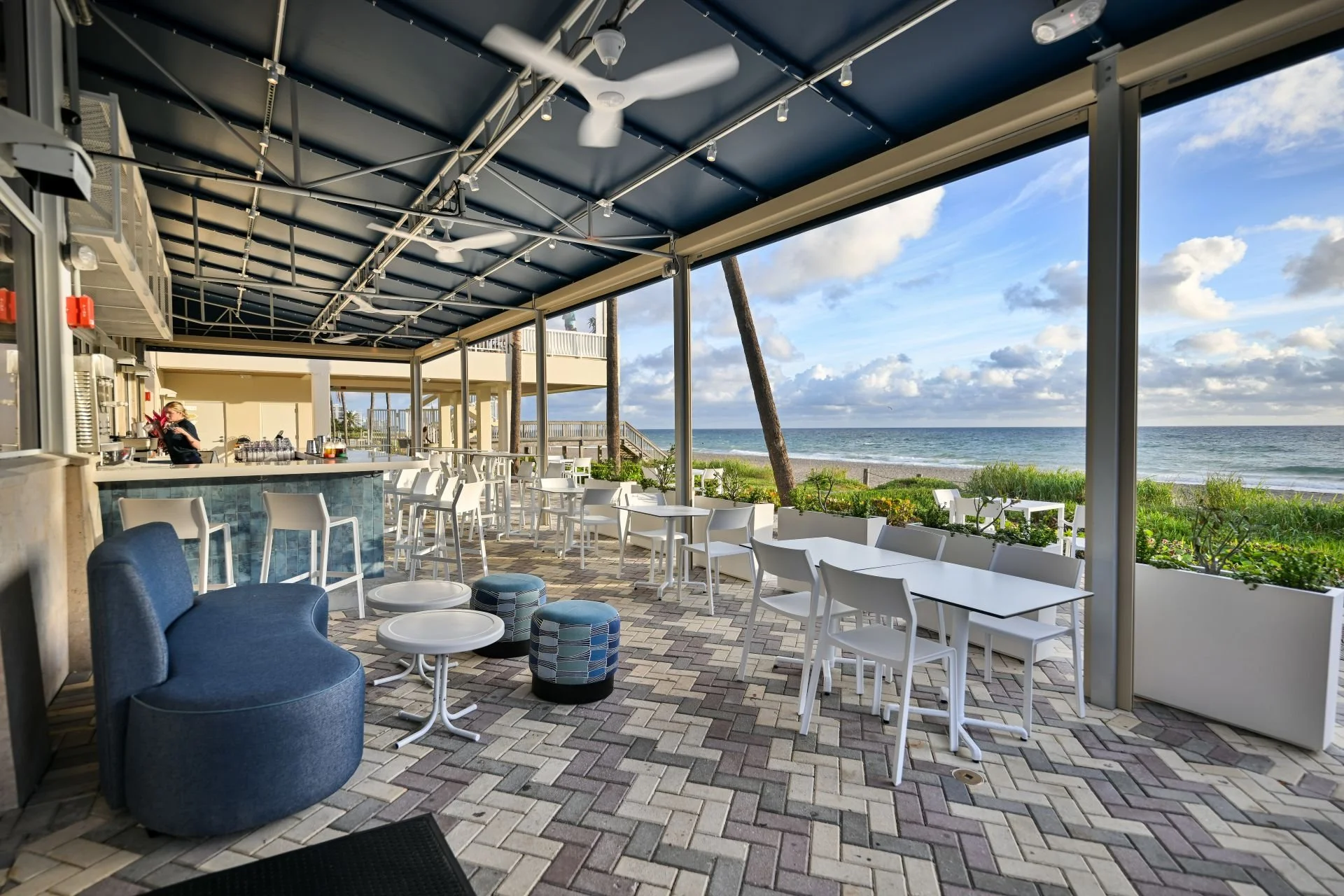 Inside, guests are greeted by oceanfront views framed by lofty ceilings, anchored by wood geometric light pendants hanging overhead. The interiors blend deep navy and soft neutral tones, with glossy tiles adorning the walls and light wood floors creating a polished coastal feel. Just outside, a dark blue–tiled bar continues the beachside energy, offering the perfect spot to enjoy the ocean breeze and direct views of the pier.